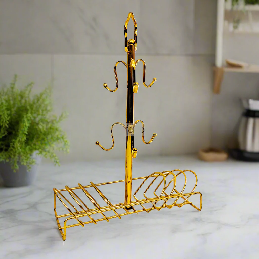 Add elegance and convenience to your kitchen with this Gold Cup & Saucer Rack, designed to hold up to 6 cups and 6 saucers in a compact and stylish form. The sleek golden metal finish pairs beautifully with modern or classic decor, making it a practical yet decorative addition to your space.