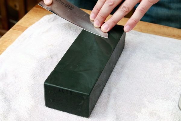 During sharpening, keep the blade at a roughly 20-degree angle. Run the knife from base to tip along the length of the stone in a sweeping arc motion. Test the edge after at least five strokes and when satisfied, flip the knife over and sharpen the other side.